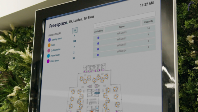 Large Freespace digital screens installed throughout the building for colleagues to find each other and show desk availability at a glance. With smaller touch screens facilitating real-time name searching for colleagues, showing which desk their colleague is seated at and where that desk is.